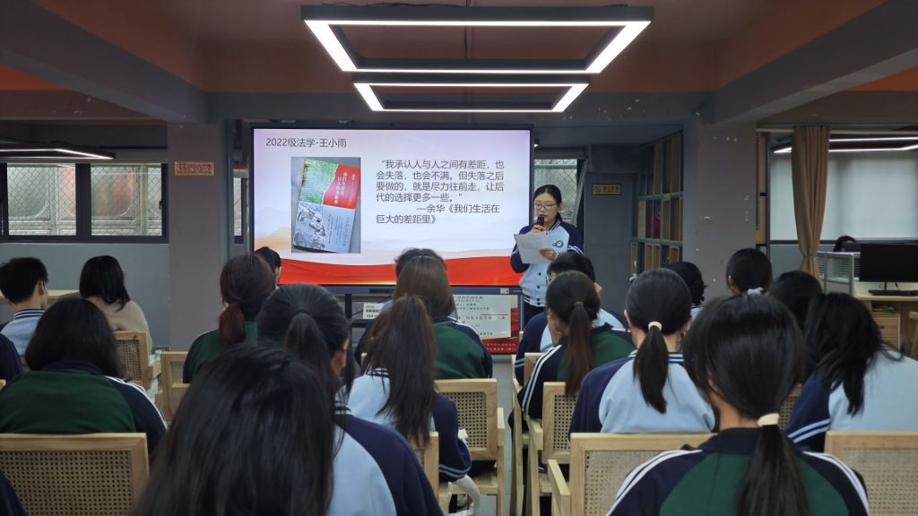 活动严格落实“第一议题”制度,首先开展了深入的理论学习。在图书分享环节,党员王小雨分享了余华的《我们生活在巨大的差距里》。她谈到,阅读这本书让她对社会现象有了更为深刻和全面的认识。在书中,余华用一个个鲜活的故事,展现了不同人群在巨大差距下的生活状态与命运轨迹,这让她深刻意识到社会公平与和谐发展的重要性。2022级法学专业年级长石佳佳则推荐了李梦霁的《允许一切发生》。她从图书的现实意义出发,阐述了这本书对当代年轻人面对生活挑战时的指导意义。石佳佳表示,书中传递出一种豁达、坦然面对生活变化的态度,这种态度对于在学业和未来职业发展中可能会遇到各种不确定性的大学生来说,是一种宝贵的启示。其他党员代表依次上台,结合自己的阅读体验,分享了不同类型的优秀图书,涵盖了专业学术、历史人文、励志成长等多个领域,为与会人员带来了一场精彩纷呈的精神盛宴。