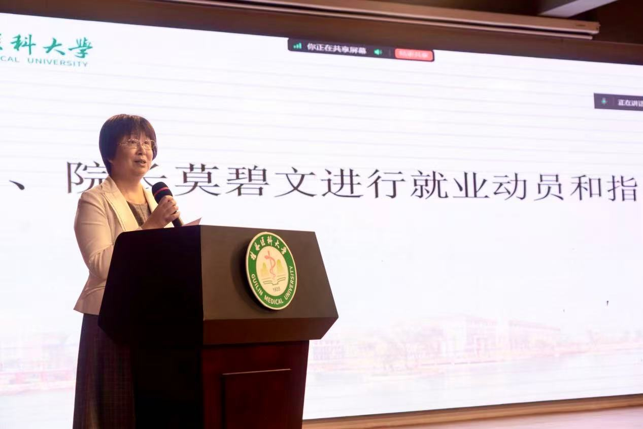 莫碧文作就业动员和指导讲话。她以“清醒、担当、奔赴”三个关键词为核心,勉励同学们要认清形势、明确目标,以积极的姿态迎接人生新阶段。莫碧文指出,面对多元化的就业选择,无论是进入医院、企业,还是选择继续深造、参加规培,同学们都应主动出击,抢抓机遇,特别是即将举行的校园就业双选会,是大家展示自我、对接岗位的重要平台,希望同学们积极把握机会。同时,她特别强调,作为医学生,不仅要关注个人发展,更要心怀“国之大者”,勇担时代责任。