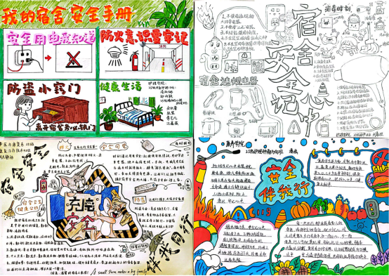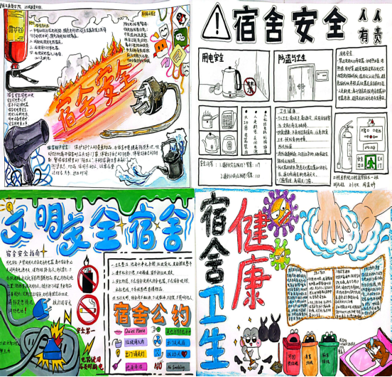 以寝室或个人为单位制作手抄报,用画笔描绘宿舍用电、防火防盗、卫生健康等安全知识,通过绘画与文字的创意结合,展现对宿舍安全的理解与重视,优秀作品将会进行展览。
