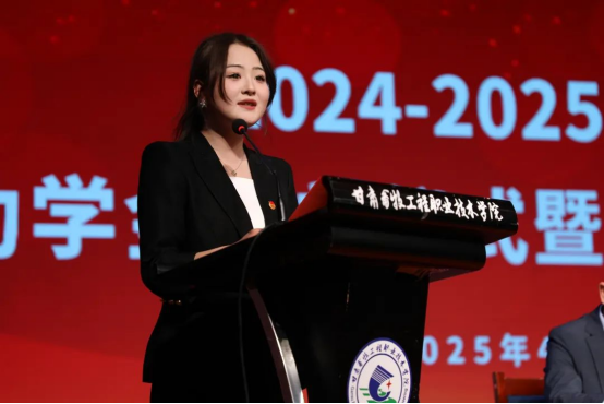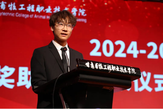 获国家奖学金学生代表、宠物科技学院宠物医疗技术2023级3班刘文婧,获国家助学金学生代表、农机与汽车学院汽车制造2023级1班慕文魁发言。