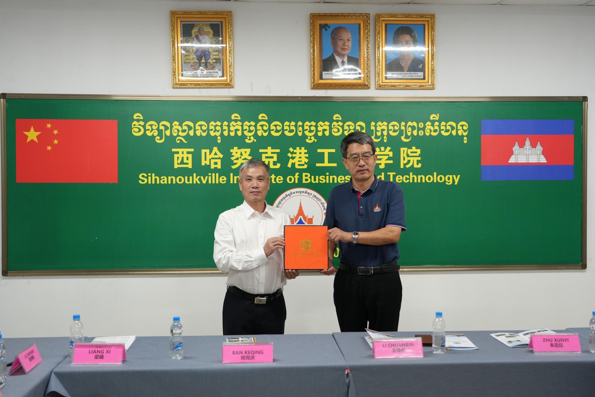 班克庆向西哈努克港工商学院院长李传彬赠送礼物