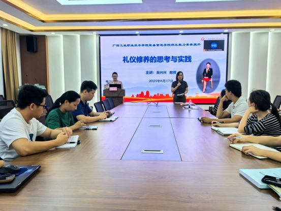 6月17日,装备智造学院特邀广西经贸职业技术学院吴兴兴教授开展《礼仪修养的思考与实践》专题培训,100余名教职工及学生干部学习职场礼仪,提升职业形象与沟通能力,为实习就业奠定基础。