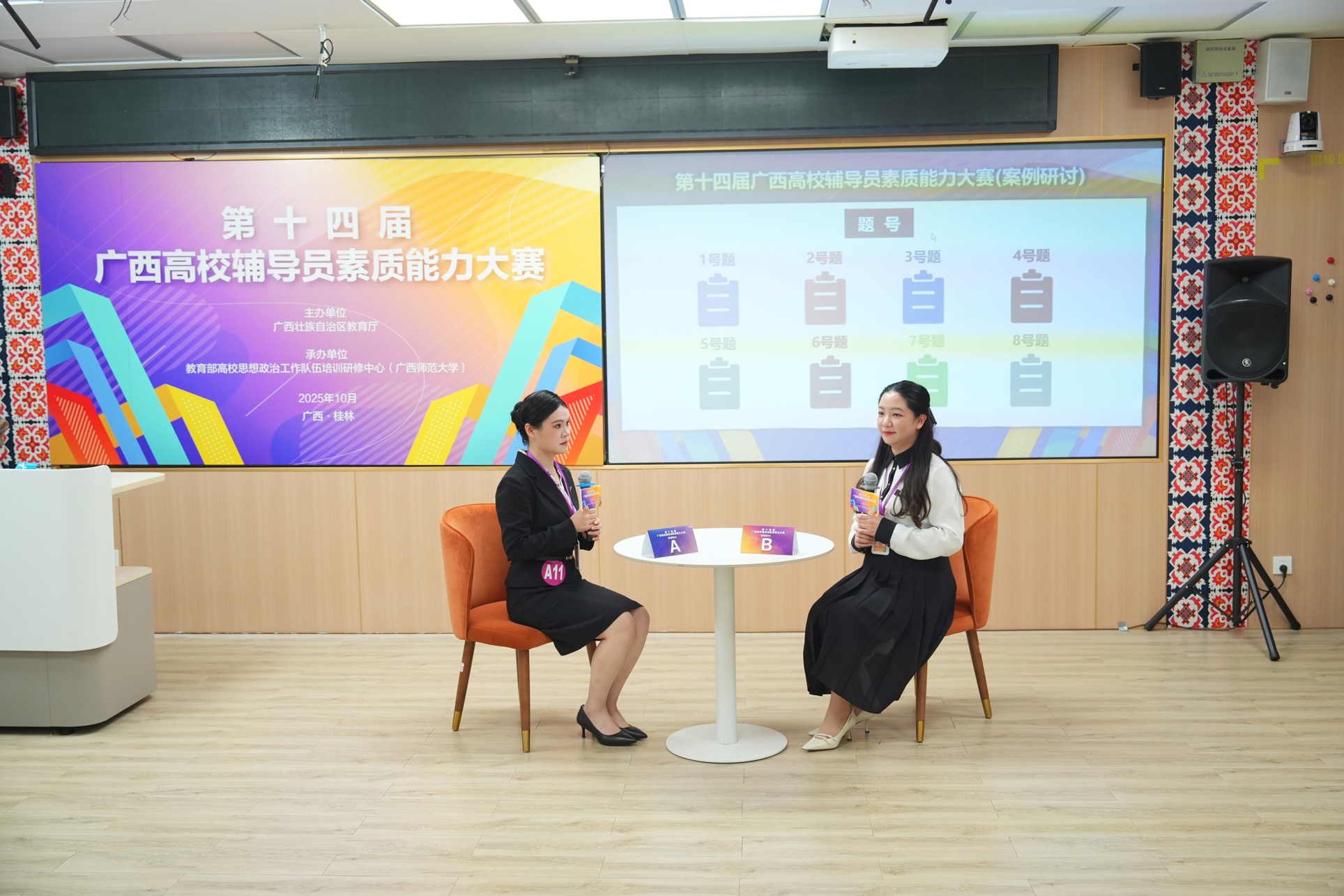 10月29日至31日,由自治区教育厅主办、教育部高校思想政治工作队伍培训研修中心(广西师范大学)承办的第十四届广西高校辅导员素质能力大赛在广西师范大学举办。我校建筑工程学院辅导员唐桂叠凭借过硬的理论素养、精湛的职业能力和深厚的育人情怀,一举斩获大赛特等奖及谈心谈话赛项最佳表现奖,成功实现我校在该自治区级重要赛事中“特等奖”与“赛项最佳表现奖”双突破;同院辅导员姚宣羽亦表现优异,荣获大赛二等奖,充分彰显了我校辅导员队伍建设的扎实成效与思想政治教育工作的高质量发展水平。