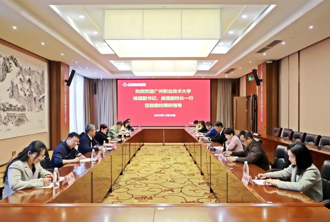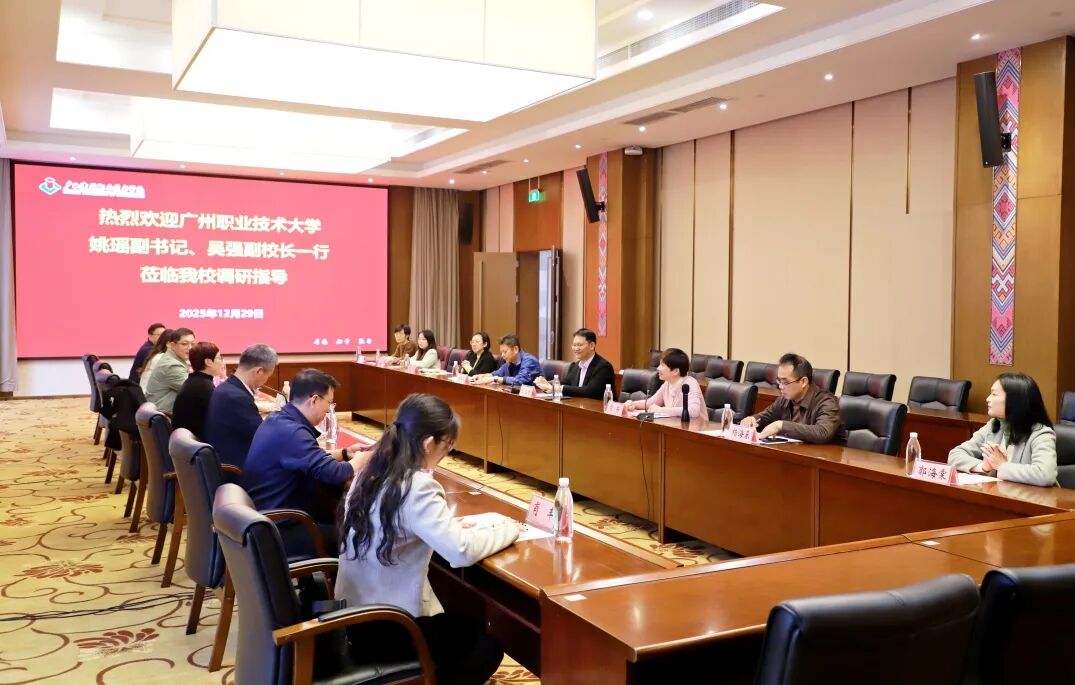 12月29日下午,广州职业技术大学党委副书记姚瑶、副校长吴强一行7人来到我校,重点围绕“一站式”学生综合社区建设工作进行调研交流,我校校长梁业胜出席调研座谈会,宣传部、学生工作部和后勤管理处领导,部分二级学院学管领导及学生工作部有关负责同志参加座谈会。