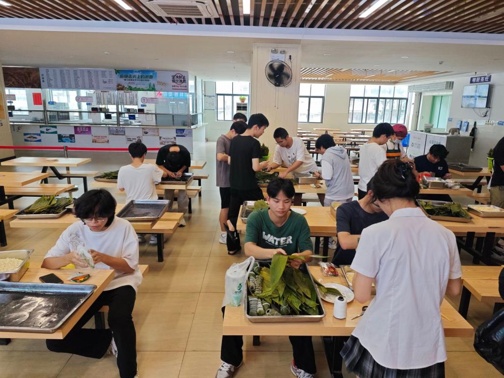 端午前夕,学校三个校区的食堂同步开展着“粽香寄家国”主题活动。清冽的苇叶香气丝丝缕缕,混杂着甜糯的米香。师生们围坐一堂,摆开了阵势,翻动苇叶,将雪白的糯米裹入其中,粽子虽形态不甚挺拔,投入锅中沸水,锅盖掀开时,白汽裹着浓香猛地腾起,学生们捧着烫手的粽子,一边吹气,一边在两手间来回倒腾。