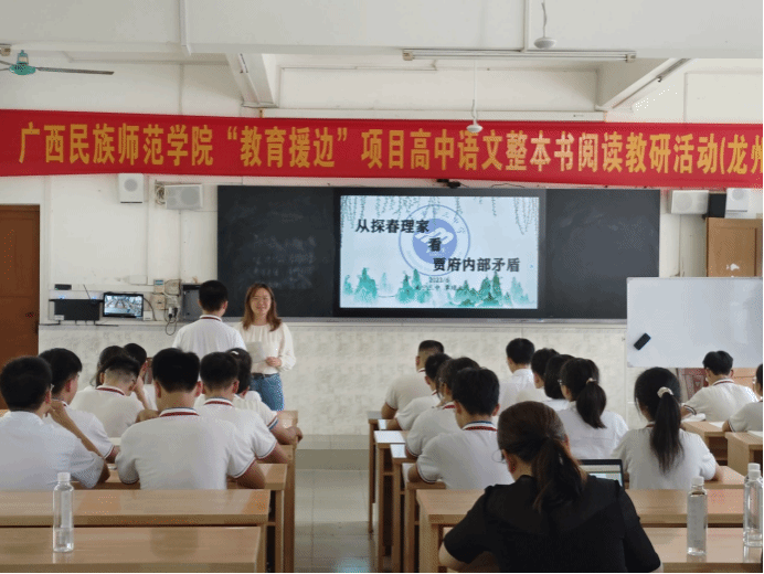 活动依次举行“携手成长 青春伴读”结对帮扶启动仪式和“相赠好书 阅读同行”赠书活动。南宁二中潘杰老师上《乡土中国》导读课;易晓老师作题为“经典作品的教学空间——《红楼梦》整本书阅读的资源意识和转化运用”的主旨报告;凭祥高中的黄学廷老师上《红楼梦》整本书阅读教学展示课:小人物,大视界—— 从《红楼梦》刘姥姥看红楼众生相;南宁三中覃璟文老师上《红楼梦》整本书阅读教学展示课:从探春理家看贾府内部矛盾。点评环节结束后卓越班学生也到班级里和凭祥高中的学生见面,制定伴读计划。