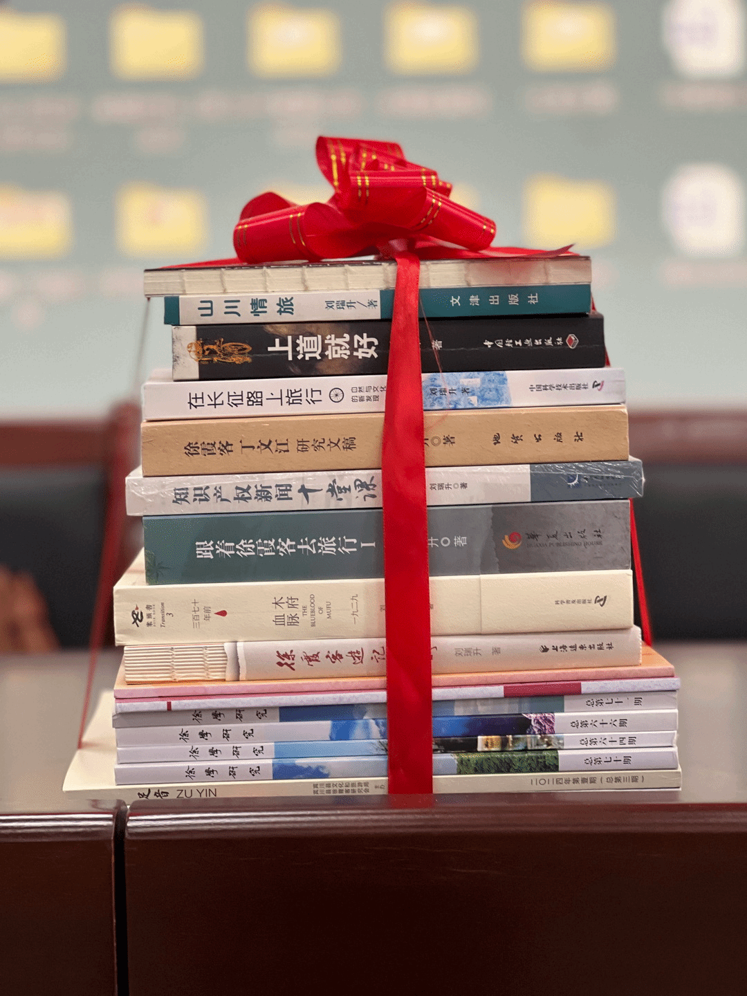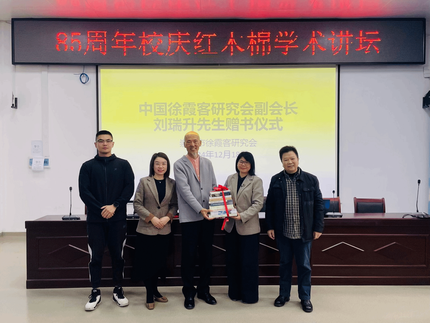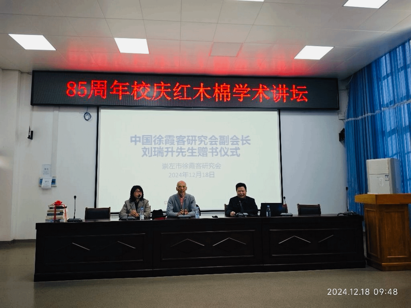 会议还宣读了来自国内20家徐霞客研究机构的贺信。刘瑞升和陈庆江两位专家分别为学校师生作了精彩的专题讲座,分享了关于徐霞客的研究心得和感悟。刘瑞升还向崇左市徐霞客研究会赠送了其所著的多本关于徐霞客的书籍,为研究会的深入研究提供了宝贵的资料。