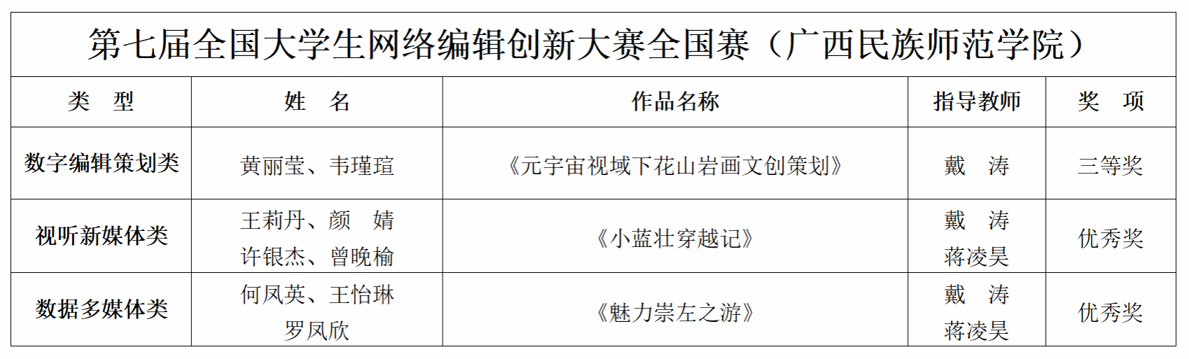 本次大赛于10月份启动,历经两个多月,采取线上+线下相结合形式,分为初赛、复赛和全国总决赛三个阶段。大赛共收到来自全国29个分赛区的3900多件参赛作品,经分赛区评审和推荐,646件作品入选全国赛。我校文学与传媒学院新闻学专业学生的3件作品获奖,其中戴涛老师指导的黄丽莹、韦瑾瑄的作品《元字宙视域下花山岩画文创策划》获得三等奖,戴涛、蒋凌昊指导的王莉丹、颜婧、许银杰、曾晚榆的作品《小蓝壮穿越记》和何凤英、王怡琳、罗凤欣的作品《魅力崇左之游》获得优秀奖。