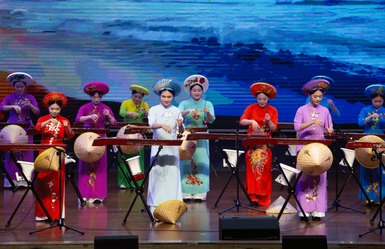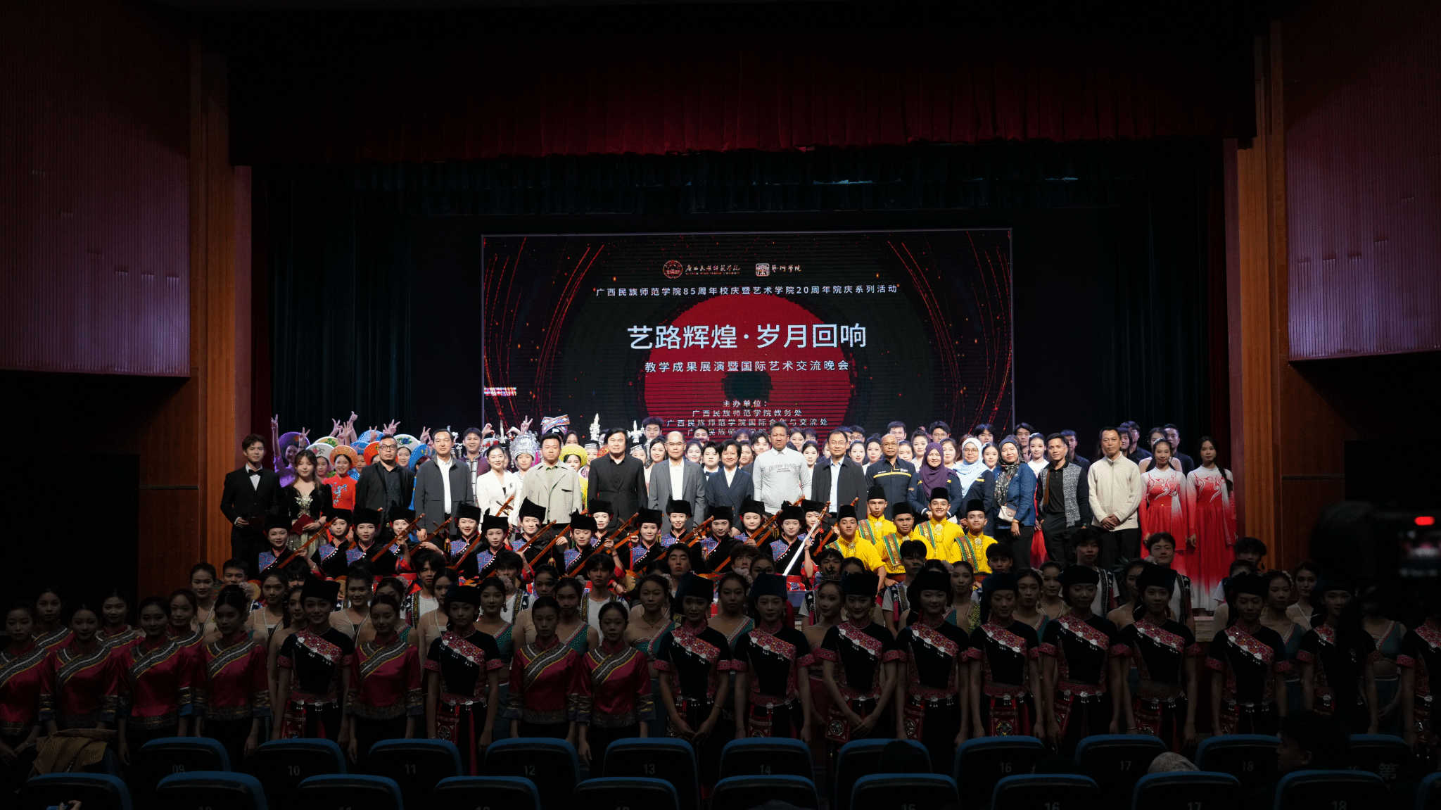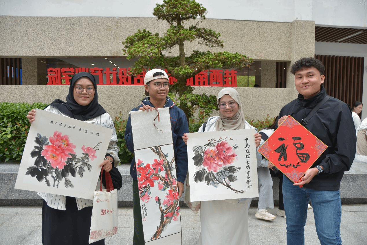 此次展览所呈现的内容丰富多样,既包含了我校与凭祥红木企业携手共创的高端家居设计、师生精心创作的书画作品,也涵盖了玛拉工艺大学师生创作的绘画、设计作品。这些作品不仅体现了地域特色,更融入了深厚的文化内涵,是两校在教学与研究领域不断探索、勇于创新的结晶。在崇艺楼庭院内,我校国内与国际学子现场挥毫泼墨,开展书画艺术交流,到访的国际友人也现场体验了中国书法的魅力。当天晚上的“艺路辉煌,岁月回响”教学成果展暨国际艺术交流晚会,将本次交流活动推向高潮,我校学子带来展现壮族民族风情、崇左特色花山文化的歌舞表演以及天琴、独玄琴、古筝、芦笙、管乐等多种乐器演奏,传统与现代艺术形式的融合尽显中华民族传统文化魅力,来自马来西亚的友人带来《魅力马来西亚》等舞蹈,让师生领略了马来西亚的异域风情,两种文化在此交流交融,碰撞出热烈的火花。