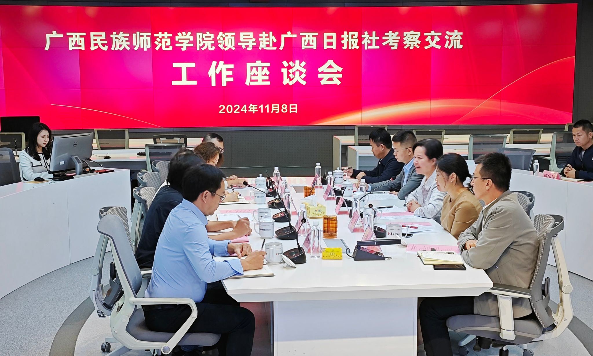 随后,双方举行了座谈会,就新闻传播学学科建设、应用型人才培养和共建融媒产业学院等方面进行了深入交流并达成了广泛共识。双方表示要发挥各自优势,优化资源配置,通过共建融媒体产业学院,积极探索融媒产业教育教学新模式,共同培养更多融媒体人才。我校一行还走访调研了光明日报社广西记者站,听取站长周仕兴介绍记者站的相关情况,双方就人才培养、学生实习就业、党媒进校园、重大课题申报等方面开展了深入交流。