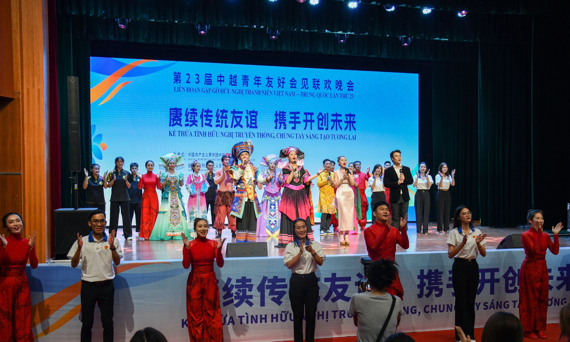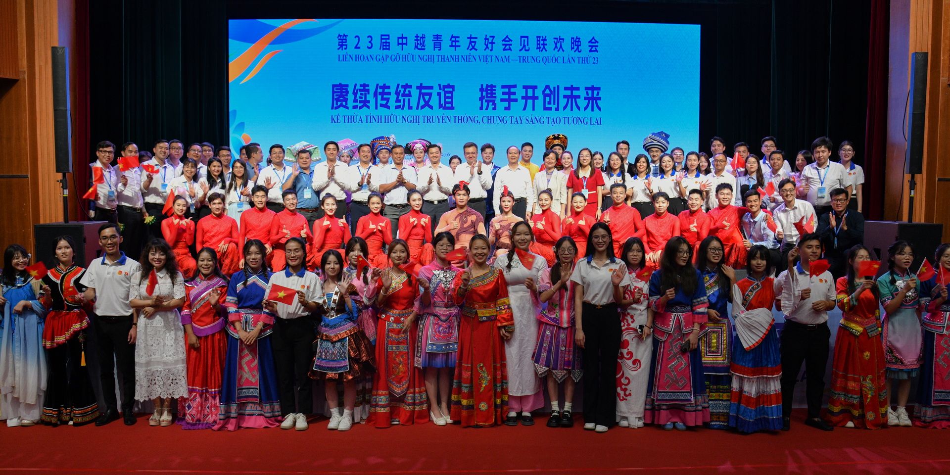近日,以“赓续传统友谊,携手开创未来”为主题的第23届中越青年友好会见活动在崇左市成功举办。作为本次活动的亮点之一,第23届中越青年友好会见联欢晚会在我校崇雅楼音乐厅圆满举行。中国共青团中央书记处书记夏帕克提,越南胡志明共青团中央书记处书记阮明哲,崇左市委常委、组织部部长黄开道,我校党委书记曹迎莅临观看晚会。中越两国青年代表共300余人欢聚一堂,共同见证了这场充满欢乐与友谊的文化盛宴。