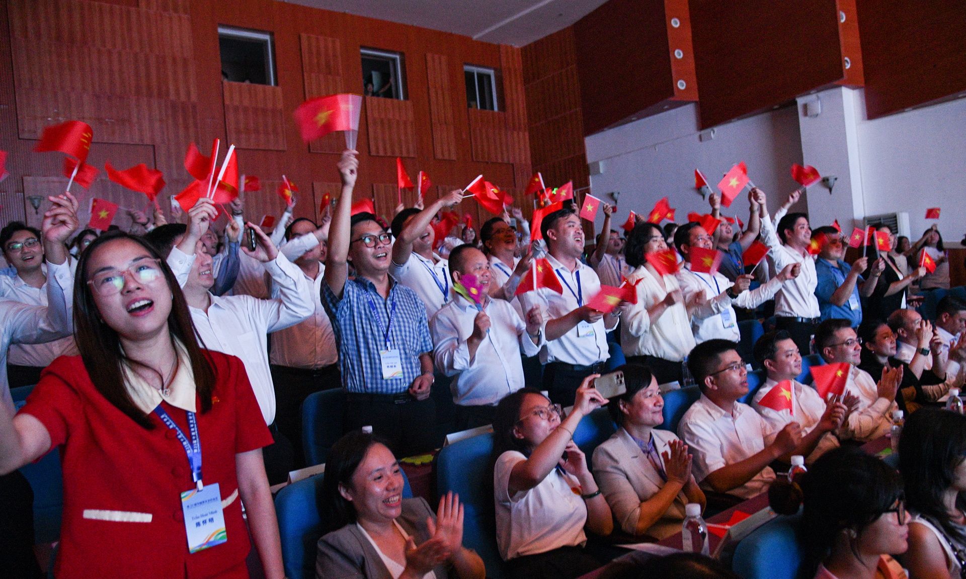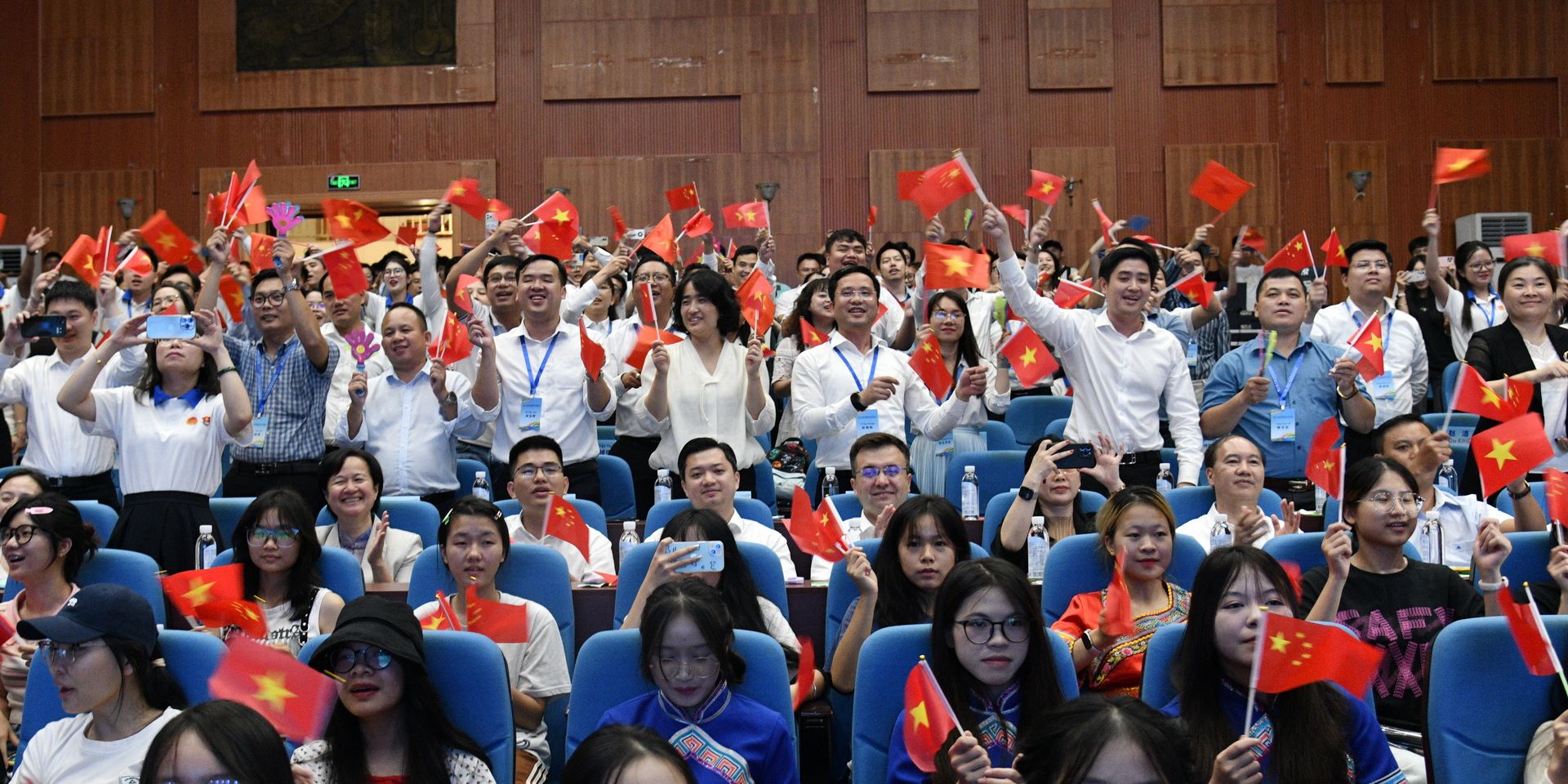 尤为引人注目的是,中越两国演员同台演绎的歌伴舞《遇见挚爱》,将晚会推向了高潮。两国青年在舞台上共舞,用歌声与舞蹈传递着对彼此的深情厚谊,现场观众被这份跨越国界的友谊深深打动,纷纷起身跟随旋律摇摆,挥动着手中的小红旗,共同感受这份跨越国界的友谊与欢乐。随着观众的欢呼声与掌声,本次中越青年友好会见联欢晚会圆满落下帷幕。