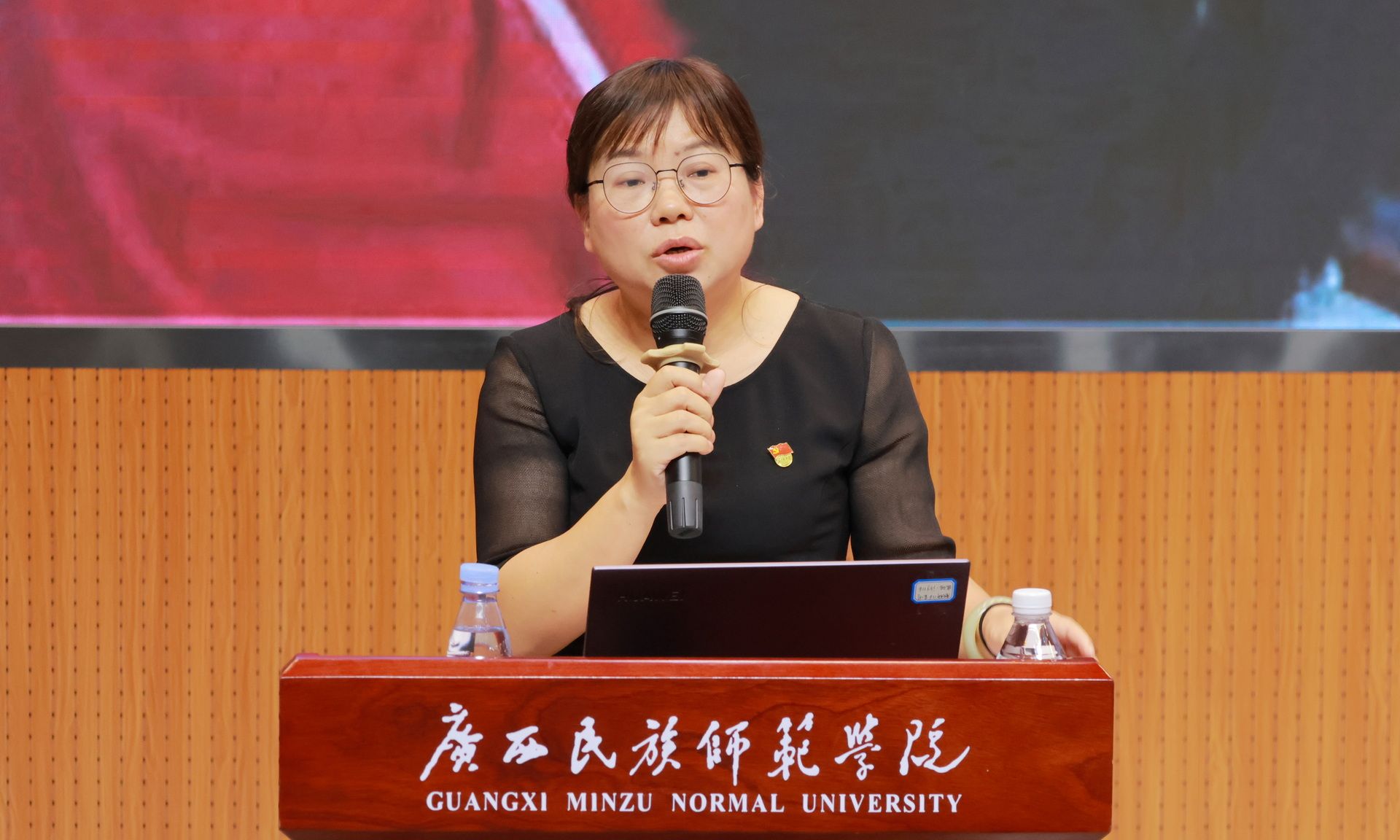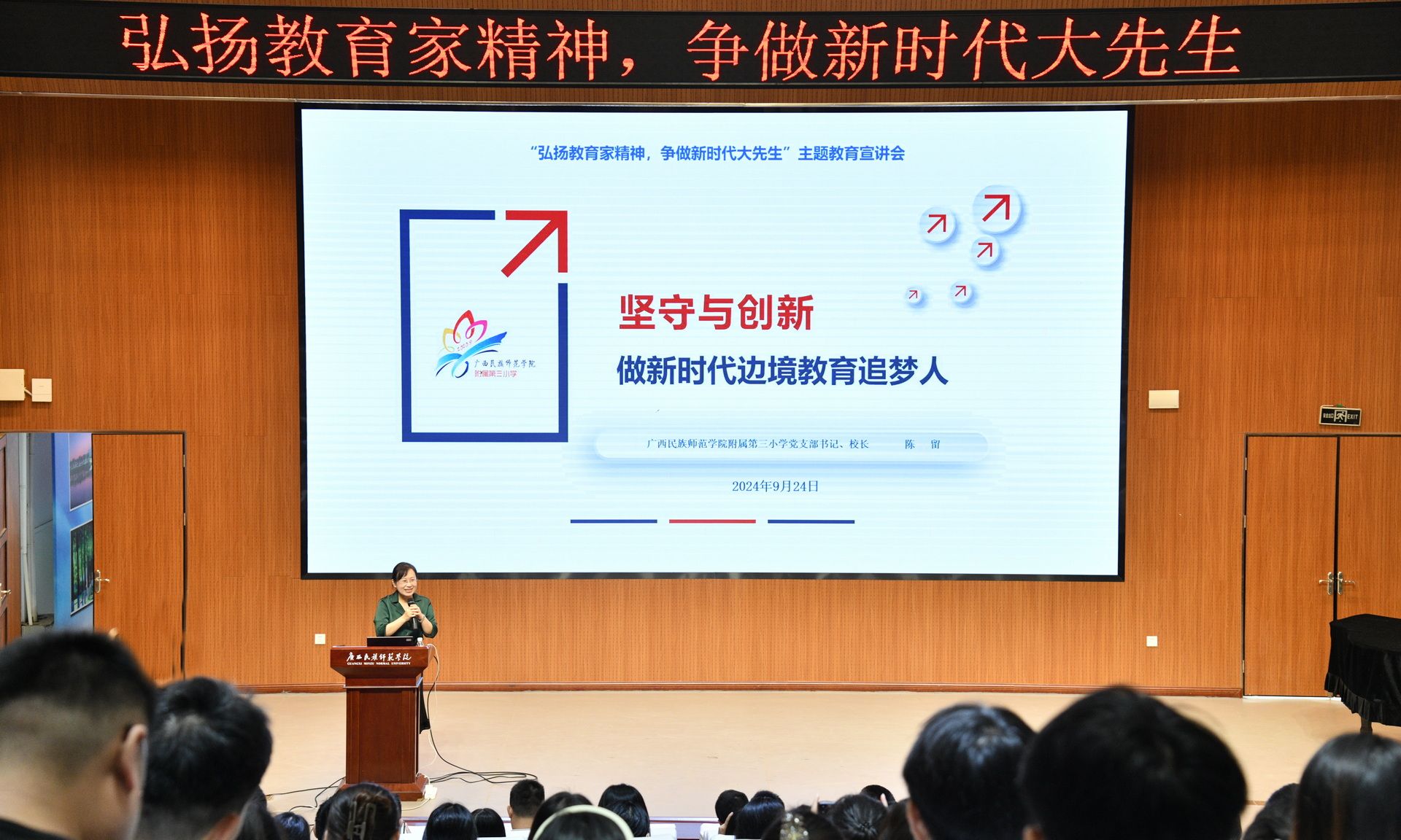 9月24日上午,我校在明德楼116报告厅举行“弘扬教育家精神,争做新时代大先生”主题宣讲会,旨在深入学习贯彻习近平总书记关于教育的重要论述,大力弘扬教育家精神,引导广大教师深刻认识在教育强国、科技强国、人才强国建设中肩负的光荣使命和重大责任,引导广大师范生自觉树立教师职业理想。宣讲会邀请了全国优秀教师、广西教学名师、广西民族师范学院附属第三小学党支部书记、校长陈留,自治区模范教师、我校文学与传媒学院教授苏洁梅作主题宣讲,副校长农克良出席活动,青年教师代表、师范生代表和党委教师工作部全体人员200多人参加本次宣讲活动。