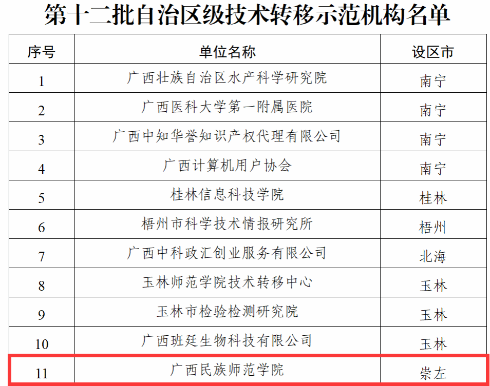 8月30日,广西壮族自治区科技厅公布了第十二批自治区级技术转移示范机构名单,我校获批成为自治区级技术转移示范机构,为学校新增一个省级科研平台,为进一步做好科技成果应用与转化工作打下了坚实的基础。