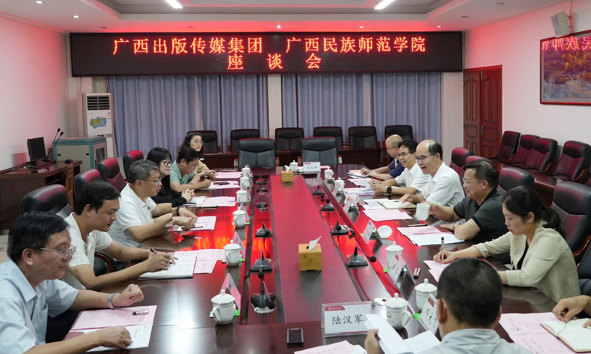 7月11日下午,广西出版传媒集团党委副书记、副董事长、总经理张艺兵一行6人来我校考察交流,受到校党委书记曹迎、校长马宁、党委副书记韦永恒、副校长韦茂斌等的热情接待,双方交流座谈会崇德楼会议室举行。
