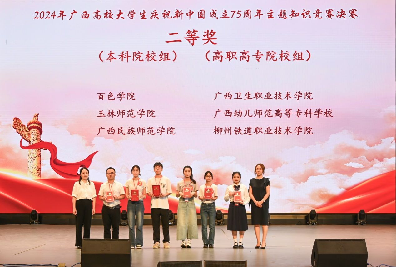 5月25日,由广西高教学会图书馆专业委员会、广西高校图书情报工作指导委员会主办,广西生态工程职业技术学院承办的2024年广西高校大学生庆祝新中国成立75周年主题知识竞赛决赛圆满落幕。经过层层选拔,我校由来自数学与电子信息工程学院唐川川、农惯,经济与管理学院李烨清等三位同学组成的代表队,在决赛中发挥出较高的竞技水平,荣获本科组二等奖,罗彬香老师获得优秀指导奖。