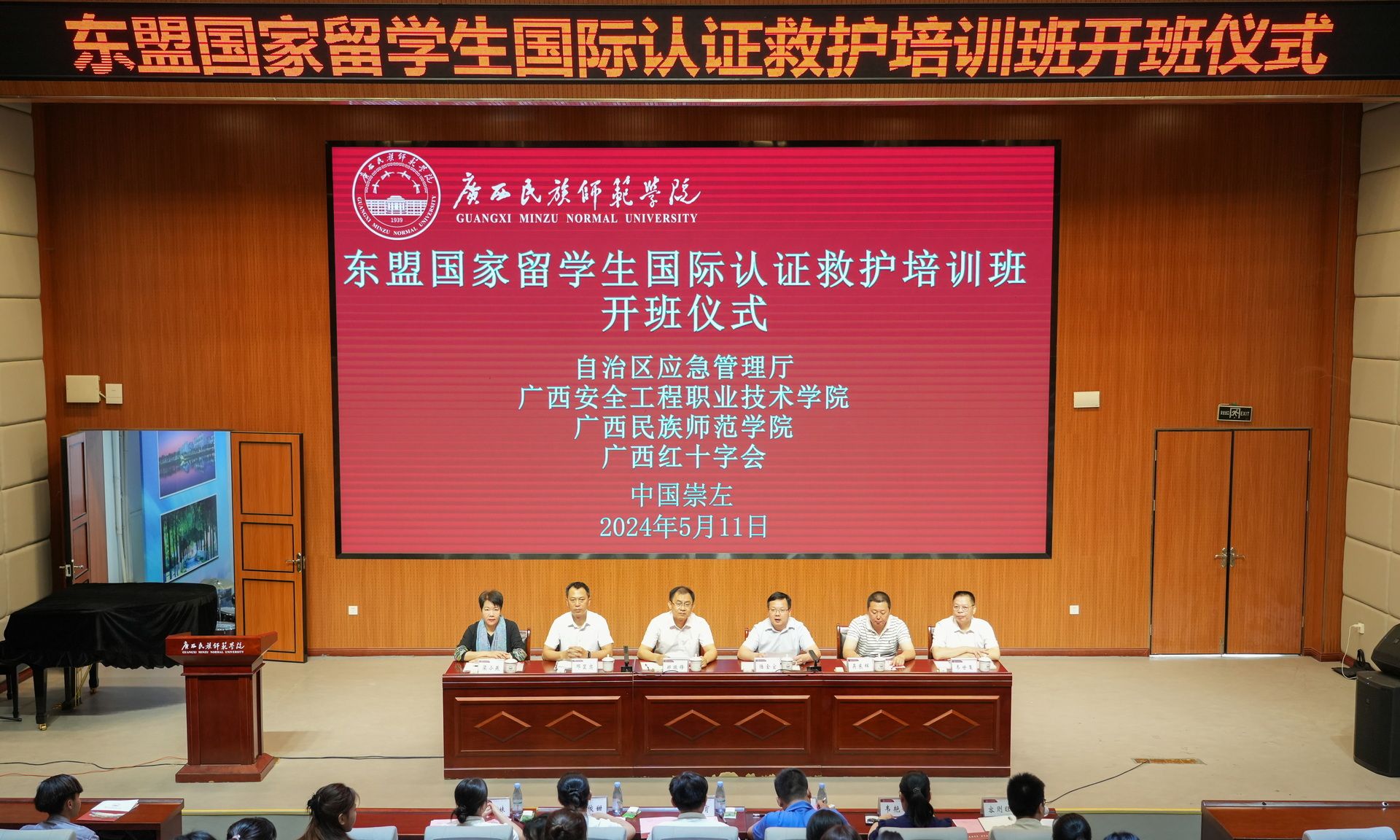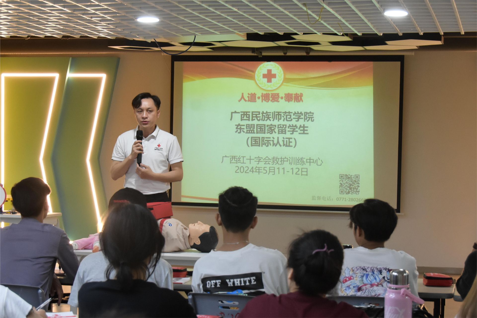 5月11日至12日,由广西安全工程职业技术学院与我校联合举办的东盟国家留学生国际认证救护培训班在我校举行。自治区应急管理厅协调处处长、广西安全工程职业技术学院党委书记陆金宜和我校副校长郑振锋出席开班仪式并致辞。培训班邀请了广西红十字会专业教师团队进行培训。我校东盟国家留学生40余人参加培训。