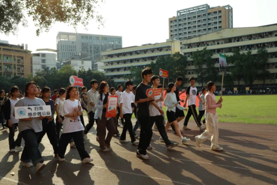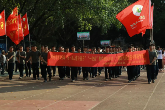 在热烈的掌声中,共青团河池市委员会书记孙瑞宣布活动正式启动。在标兵引领下,各学院学生代表整齐列队,与主席台领导一同围绕田径场行进两圈。步伐铿锵间,师生们以实际行动诠释“人人公益”理念,现场将当日步数兑换为“温暖家庭箱”配捐,为困境家庭点亮希望。