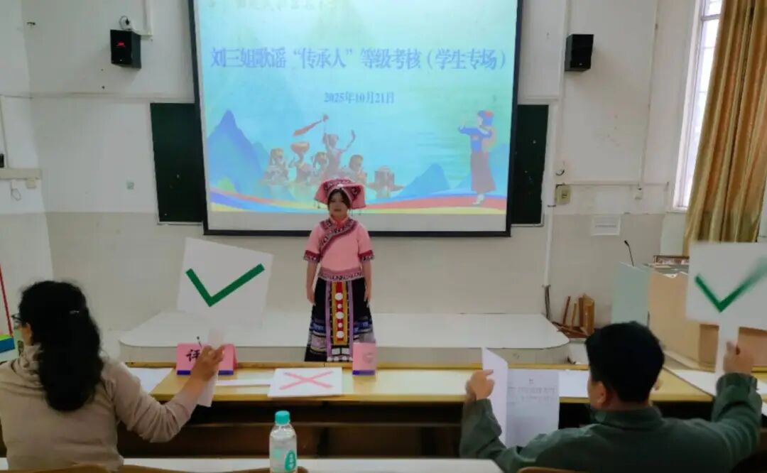 为传承广西文化瑰宝“刘三姐歌谣”,我校于10月21日在教学楼阶梯教室,举办面向学生的“刘三姐歌谣”传承人等级考核专场活动。考核现场,考生们身着艳丽民族服饰、精神饱满地脱稿清唱,以清亮歌声和饱满情感尽显刘三姐歌谣的独特韵味与艺术魅力。