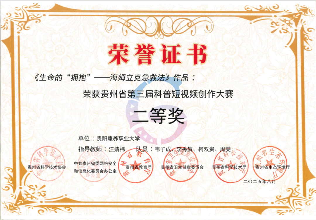 9月4日,由贵州省科学技术协会、中共贵州省委网络安全和信息化委员办公室、贵州省教育厅、贵州省卫生健康委员会、贵州省科学技术厅、贵州省生态环境厅联合举办的贵州省第三届科普短视频创作大赛获奖结果正式公布,由学校党委学生工作部牵头,师生团队创作的科普作品《生命的“拥抱”——海姆立克急救法》荣获学校组二等奖。