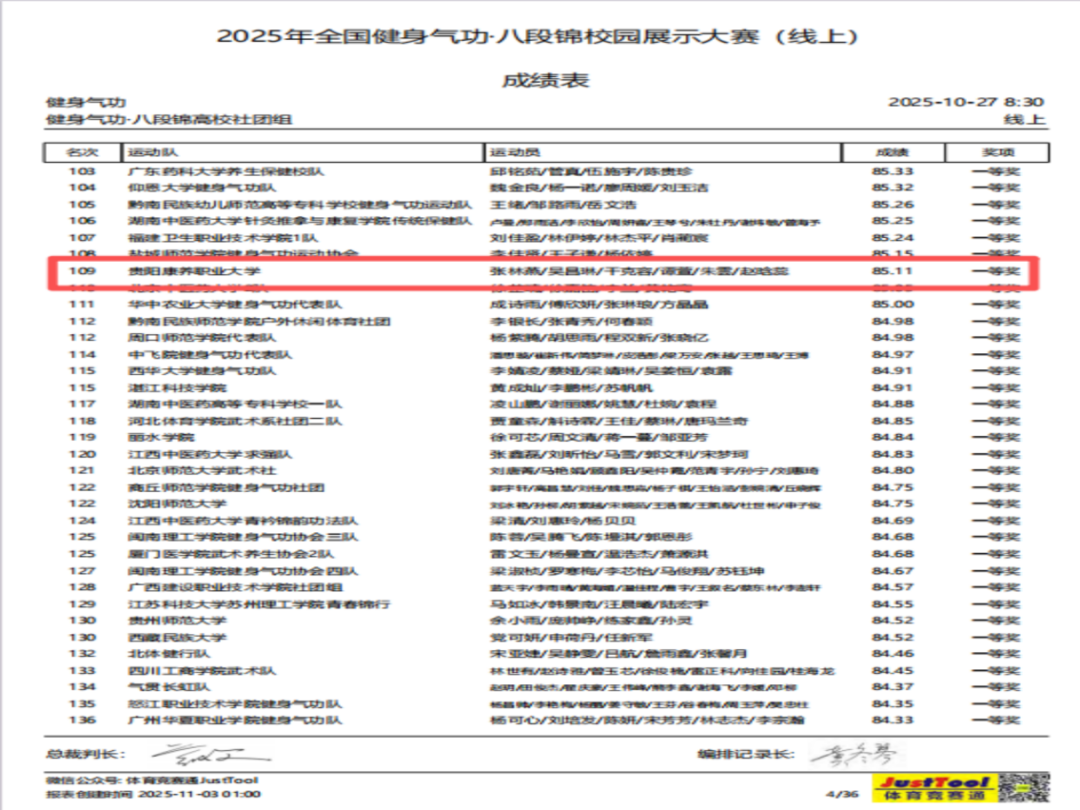 本次大赛吸引全国各级院校共1217支队伍参赛,竞争极为激烈。经严格评审,学校健身气功队参赛队凭借卓越表现,于千余支队伍中崭露头角,荣获大赛一等奖,为学校赢得荣誉。