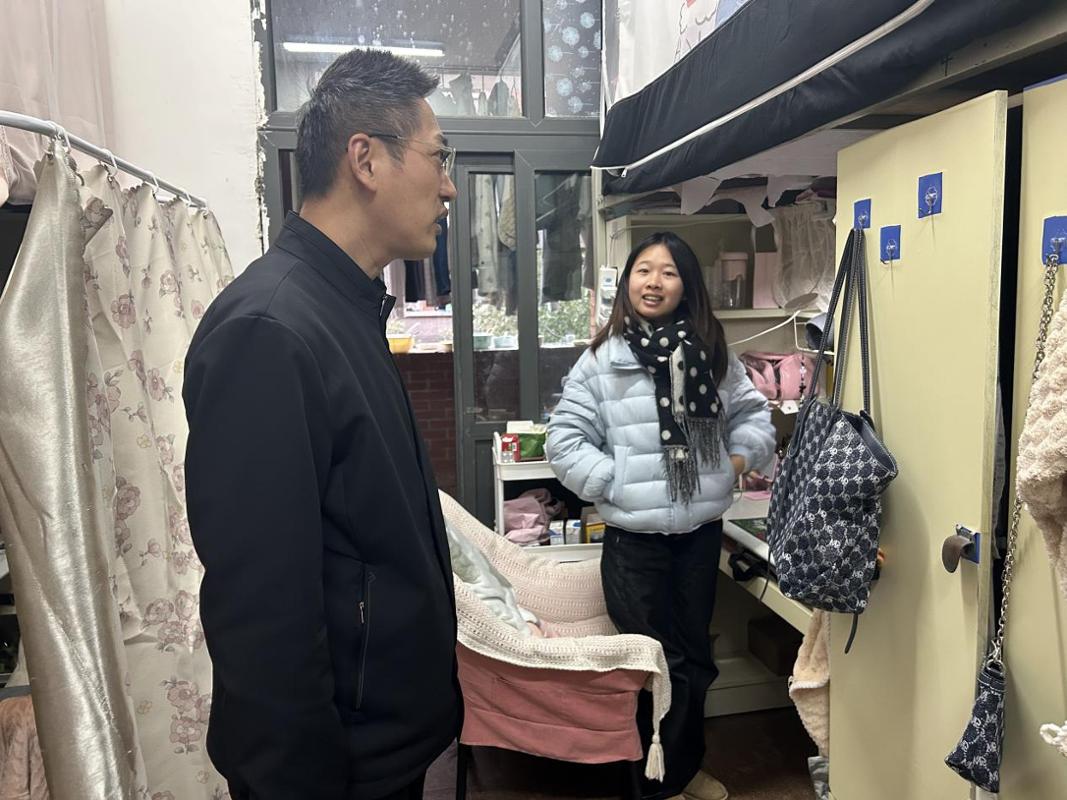 随后,杜剑副校长一行深入学生寝室,与同学们面对面亲切交流。每到一间寝室,他都仔细察看住宿环境、设施配备及消防安全情况,关切地询问同学们来自哪里、是否适应校园生活、学业进展如何以及在生活中是否存在困难。当看到寝室环境干净整洁、同学们相处融洽时,杜剑副校长十分欣慰,他勉励同学们要珍惜大学时光,既要扎实学好专业知识,也要学会与人相处,在集体生活中培养团队协作意识和独立生活能力,共同营造文明和谐的寝室氛围。