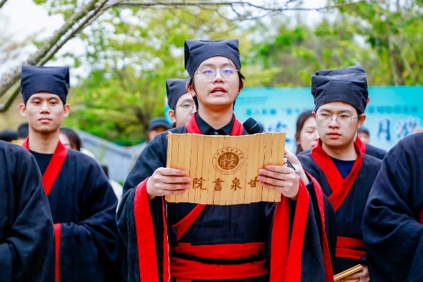 随后,赛宝湖畔举行了寓意深远的祓禊祈福仪式,再现古人临水祓除不祥的传统。上巳节的祓禊习俗源远流长,最早或可追溯至周朝,寄托着先民对祛邪避疫、祈福纳祥的美好憧憬。仪式现场,庄严肃穆的古乐声悠悠回荡,主礼者手持柳条,蘸取清水,依次轻轻拂拭受盥者,为其洗濯洁体,并诵读祝文。在祈福仪式之后,扑面而来的是“琴韵茶香”的雅致情趣。由我校清心茶艺社和国乐社同学带来的“琴韵茶香”表演,让观众沉浸在悠扬的古筝声与袅袅茶香之中,琴音与茶香和谐交融,尽显传统生活悠然典雅之美。