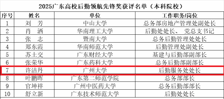 近日,广东省高校后勤协会正式发布《关于表彰2025年度广东高校后勤系统评优评先获奖名单的决定》,我校在学生公寓管理、绿色低碳建设与个人荣誉等多个方面取得佳绩,充分展现了我校在服务育人体系建设方面的综合实力与创新成效。