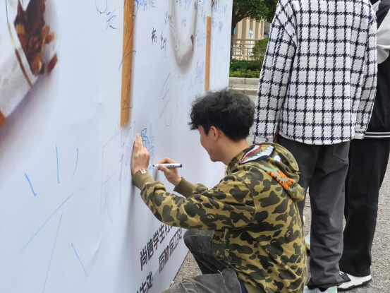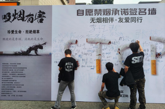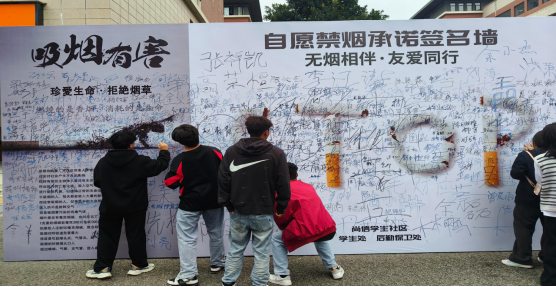 “无烟相伴・友爱同行”——尚信社区同伴月自愿禁烟承诺行动得到了同学们的积极响应。同学们纷纷在签名墙上签名,许下不在公共场所吸烟的承诺。现场的电子屏滚动播放吸烟有害健康宣传片,进一步增强了大家的禁烟意识。“校园文明岗”的设立,让学生志愿者参与到校园巡查中来,形成了良好的同伴教育闭环。