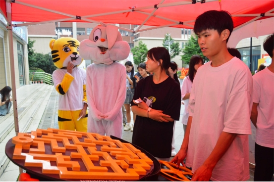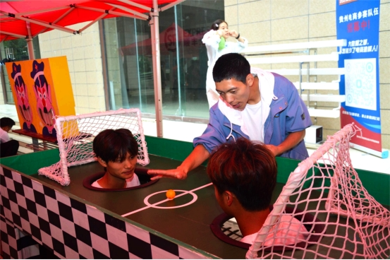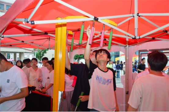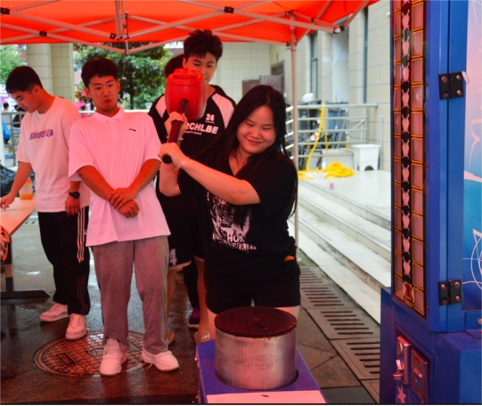大力锤、笑掉大牙前排起长队,同学们化身“压力粉碎机”,将焦虑化作一声声呐喊与大笑。游戏区更是热闹非凡,嘴上足球你来我往,眼疾手快看谁更迅速……现场欢呼声阵阵爆发。碰撞球更是有老师与同学组队竞技,师生之间的默契配合与欢乐互动,让现场洋溢着温馨和谐的氛围。
