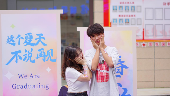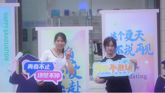 “希望食堂阿姨永远不手抖!”“下次见面,我们都是更好的大人!”留言墙上写满了同学们的寄语,字字句句皆是眷恋。在打卡区前,毕业生们呼朋唤友,在“这个夏天不说再见”“我们毕业啦”背景板前合影,让摄影社的同学为他们用镜头定格“青春限定版”笑容。