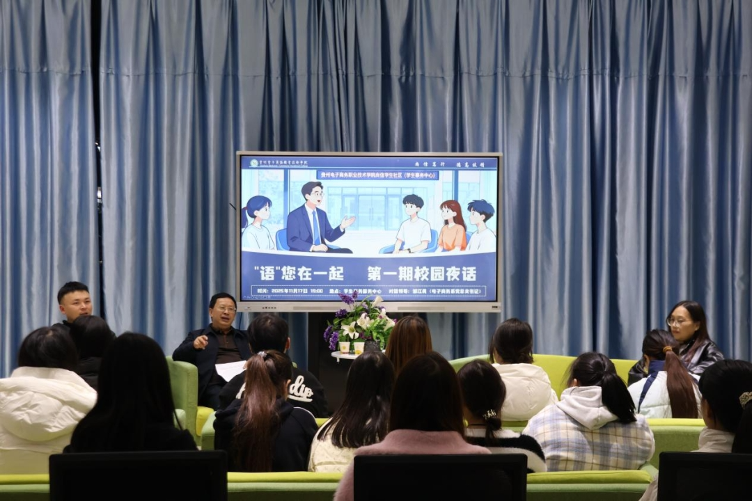 11月17日晚,学院在尚信学生社区学生事务服务中心成功举办第一期“语您在一起·校园夜话”师生面对面活动。电子商务系党总支书记邹江勇、学生处、辅导员代表与20名学生代表齐聚一堂,围绕校园建设与学生发展展开深入交流。