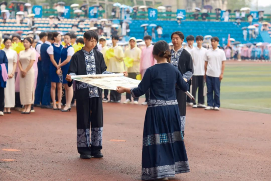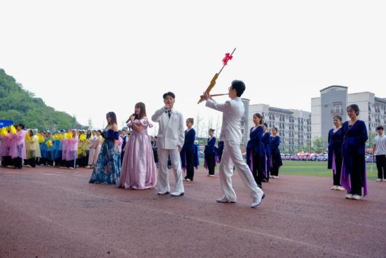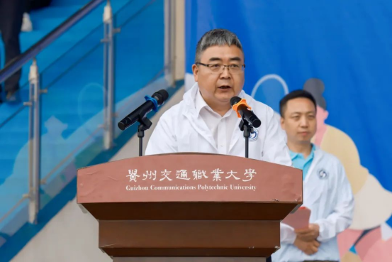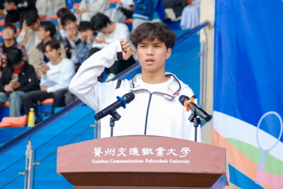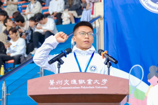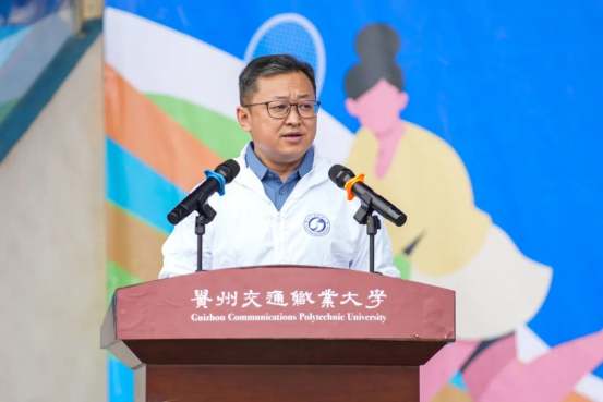 副院长詹黔江致辞,他表示,本次运动会是学校一年一度的体育盛事,也是学校更名升格后的第一届体育健康运动会,内容十分丰富,适宜群体广泛,活动意义重大。他分享了三个方面与大家共勉:一是以赛铸魂,弘扬体育精神。希望大家在一场又一场的竞技比赛、一次又一次的意志砥砺中,培养团队精神、竞争意识和坚强毅力。二是以赛促练,提升竞技水平。鼓励大家多去参加各类大赛,把贵州交职大的名片在竞技赛场上擦亮。三是以赛健身,拥抱强健体魄。希望以运动会为牵引,通过增设更加丰富的体育选修课程、增加运动场所等方式,引导大家业余时间到运动场上来,助力每位师生锻造强健体魄,为终身发展奠定坚实基础。