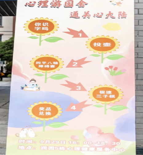 为丰富“一站式”学生社区文化生活,提升学生心理素养,培养积极心理品质,9月29日下午,我校心理健康服务中心在润园“一站式”学生社区成功举办心理游园会活动,为同学们带来一场别开生面的“心灵奇旅”。
