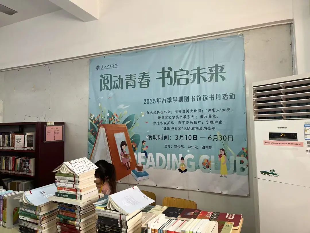 2025年4月17日,广州理工学院白云校区学生第二社区组织学生干部参观图书馆举办的“诺贝尔文学奖作家作品展”活动。