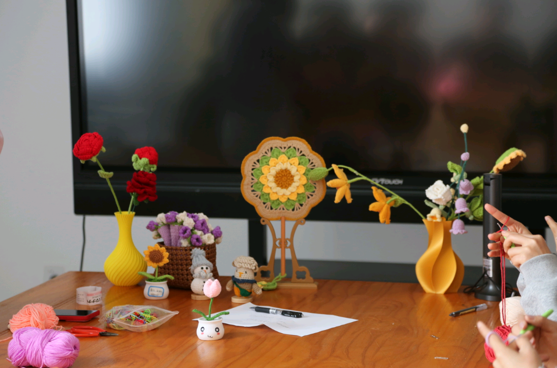 活动现场氛围热烈,周琴为同学们展示绕线、起针等基础技巧,并一一解答同学们的疑问。同学们热情高涨,纷纷动手尝试。从生疏到逐渐熟练,大家沉浸在勾线的世界中,互相交流经验、分享心得。活动结束,桌子上摆放着同学们用心钩织的精美成品,有栩栩如生的花朵、可爱的玩偶等。