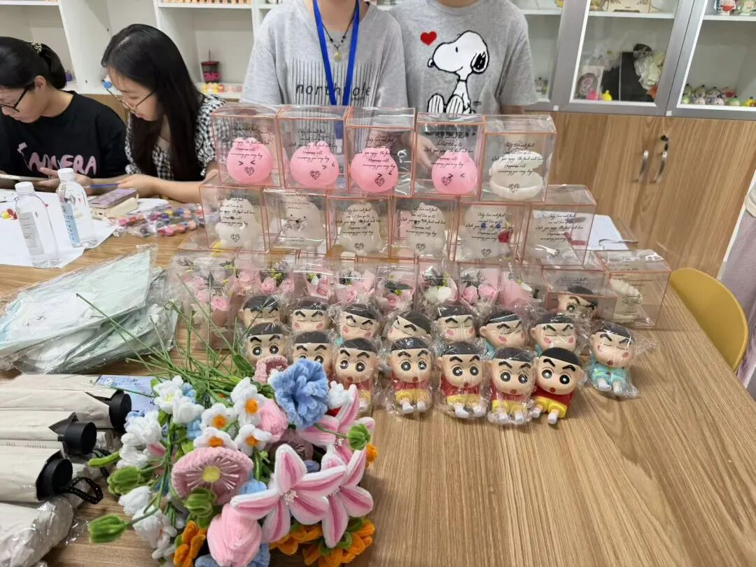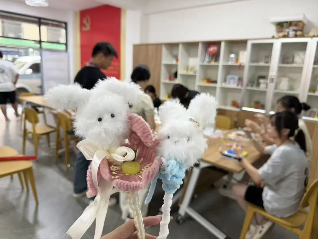 “第一次做这个,虽然手笨,但成品超可爱!”一位同学举着刚完成的扭扭棒花束,笑眼弯弯。指尖翻飞间,一圈圈扭扭棒便幻化成了玫瑰、小熊等生动造型。镜头转向游戏区,“原地踏步大挑战”现场笑声不断——有人闭着眼踏步险些出框,引得周围同学善意打趣。即便挑战失败,重新拿起扭扭棒做花时,她依然满脸笑意,仿佛挫折也被手中的色彩点亮。