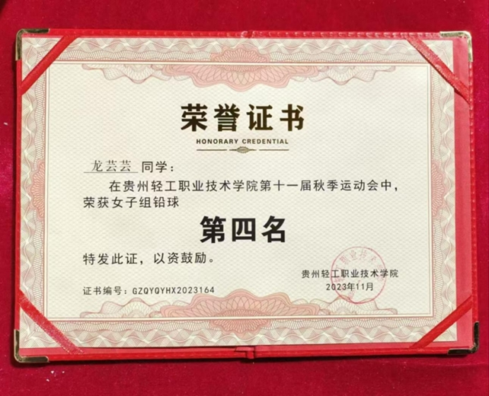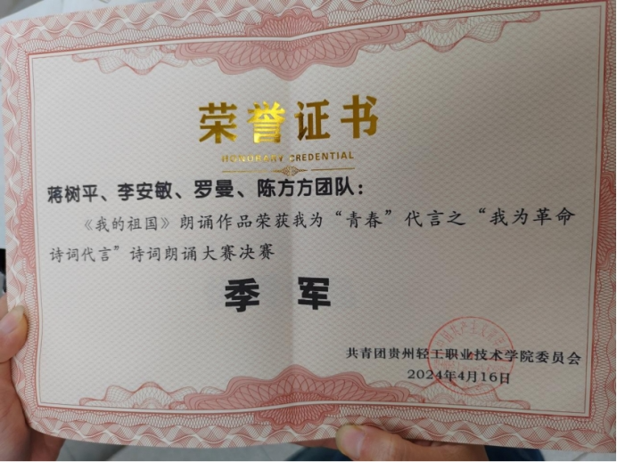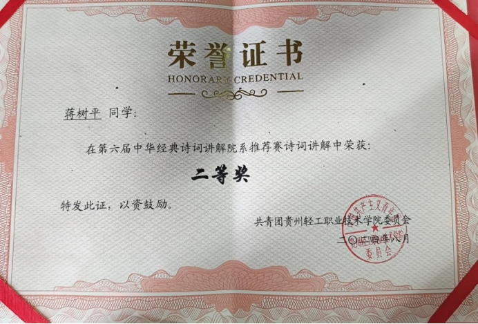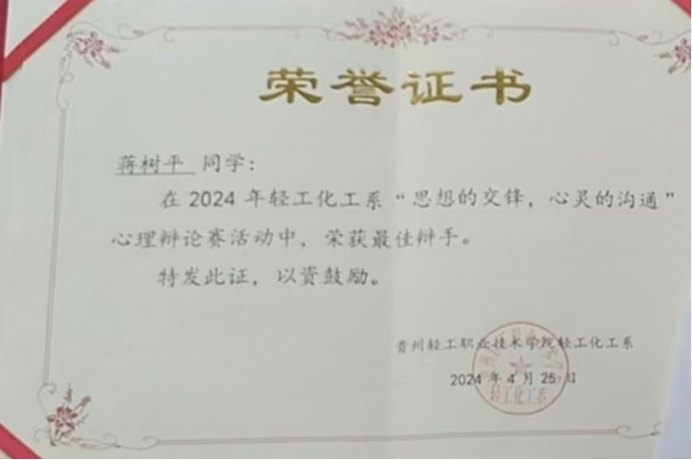 在各类活动中,班级同学更是屡获佳绩。蒋树平同学在第六届中华经典诗词讲解院系推荐赛中荣获贵州省职业技术学院二等奖,在2024年轻工化工系思想交锋心灵沟通心理辩论赛活动中荣获最佳辩手;尤芸芸同学在贵州轻工职业技术学院第十一届秋季运动会中荣获女子组铅球第四名;蒋树平、李安敏、罗曼、陈芳芳团队在我为革命诗词代言朗诵大赛中荣获贵州省轻工职业技术学院三等奖。这些荣誉,是同学们努力拼搏的见证,也是班级荣耀的象征。