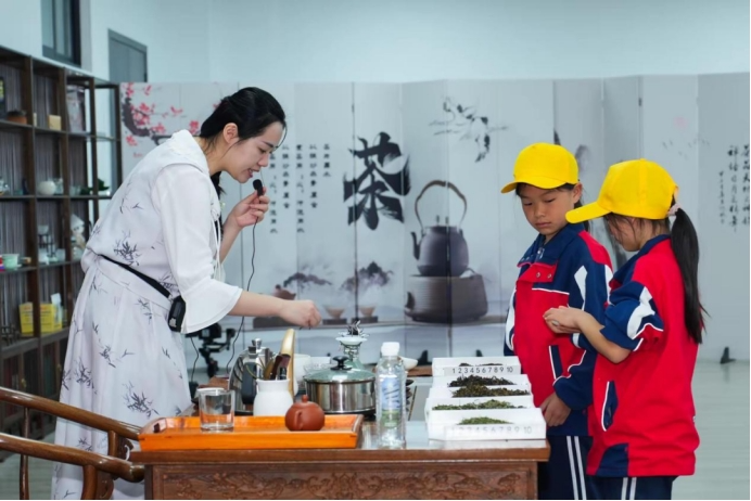 随着陶艺体验的结束,孩子们意犹未尽地走进学院文化与旅游系茶艺课堂,在茶艺师的讲解、示范下,各位小茶人温杯、投茶、注水、出汤、奉茶、品鉴……一招一式尽显优雅、别致,专注的眼神和稚嫩的动作透露出对传统文化的敬畏、热爱。
