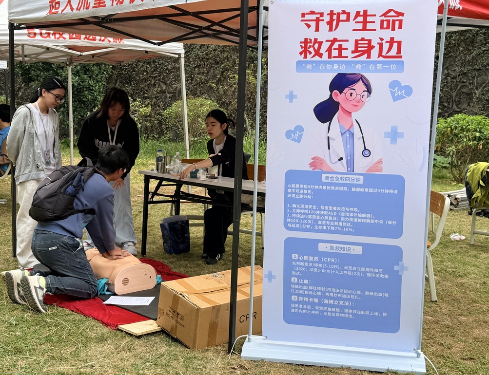 这里是整个场景中最为紧张却又意义非凡的区域。在专业志愿者的悉心指导下,同学们全神贯注地在人体模型上练习心肺复苏(CPR)和海姆立克急救法。从理论知识的学习过渡到实际操作的演练,大家不仅熟练掌握了这些关键的急救技能,更深刻领悟了在危急时刻应如何及时伸出援手,守护宝贵的生命。