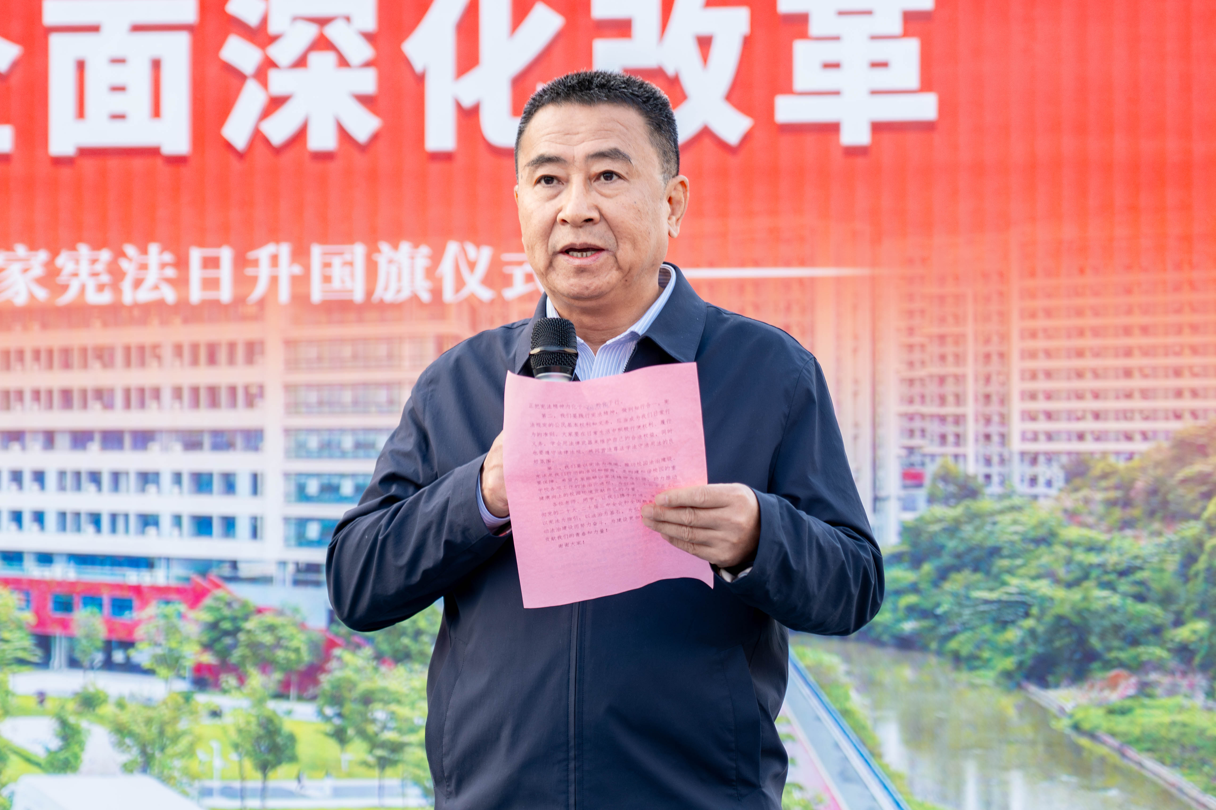 宪法为本,德规育人。升旗仪式上,我校党委书记陈光团讲话,他表示,今年宪法宣传周的主题是:大力弘扬宪法精神,推动进一步全面深化改革。学校以庄严而神圣的升旗仪式,表达对宪法的最高尊重与最深敬意。陈光团书记指出,广州应用科技学院不仅是传播知识、培养人才、服务社会的学习平台,更是弘扬宪法精神、践行法治理念的重要阵地。学校将继续深入学习贯彻党的二十大、二十届三中全会和全国教育大会精神,以宪法为指引,以法治为基石,弘扬宪法精神、推动法治建设,让每一位师生都成为宪法的忠实崇尚者、自觉遵守者、坚定捍卫者。陈光团书记提出三点希望:一是要加强宪法学习,深化对宪法的认识与理解;二是要践行宪法精神,做到知行合一;三是要以宪法为准绳,推动校园法治建设。
