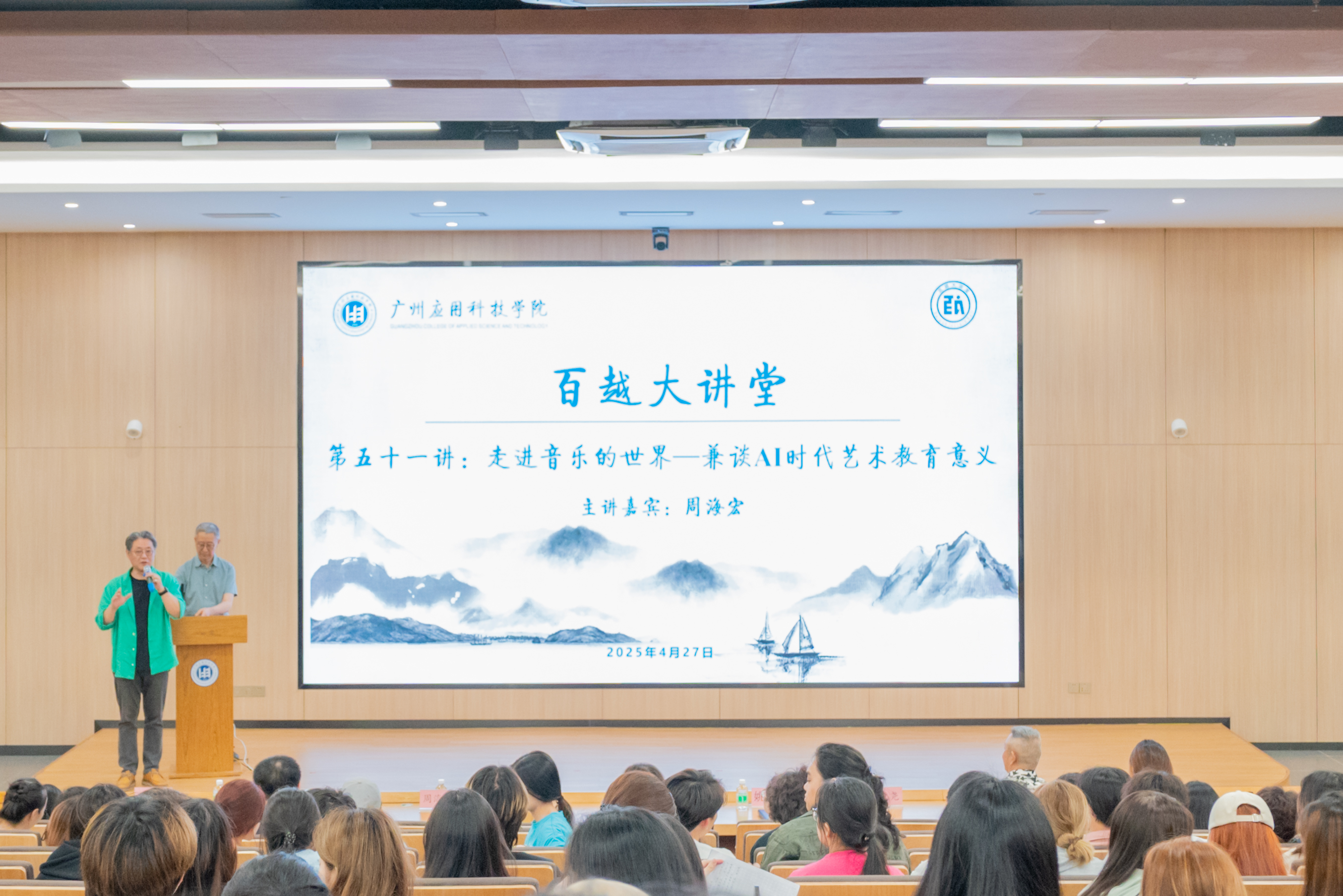 “百越大讲堂”第五十二讲于4月29号下午在图书馆一楼报告厅举行,著名音乐美学家、音乐心理学、教育学家、中央音乐学院博士生导师周海宏教授受邀为我校师生作《走进音乐的世界—兼谈AI时代艺术教育意义》专题讲座。学校董事长王睿、副校长刘志新、财务总监姚满金、团委书记郭振,音乐学院院长杨天君、副院长罗月云、副院长查甫尧及300余名师生代表共同参与了本次讲座。讲座由音乐学院院长杨天君主持。