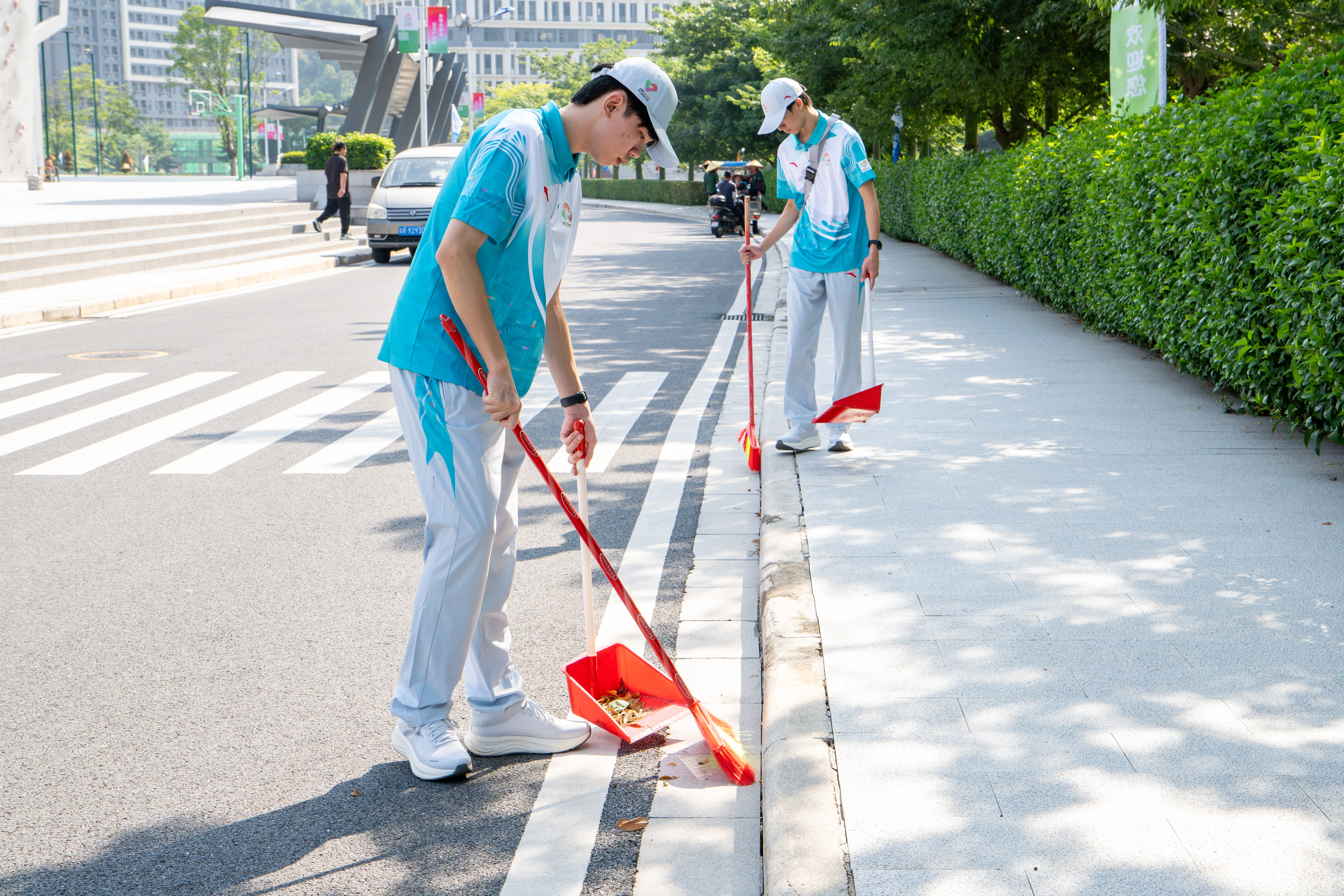 学校特别组织十五运会毽球赛事志愿者队伍积极参与本次行动。身着十五运会志愿者服装的学生志愿者们与工作人员紧密协作,重点投入到赛事场馆及周边环境的清洁整治中,他们以实际行动,为毽球赛事筑起了坚实的健康屏障。