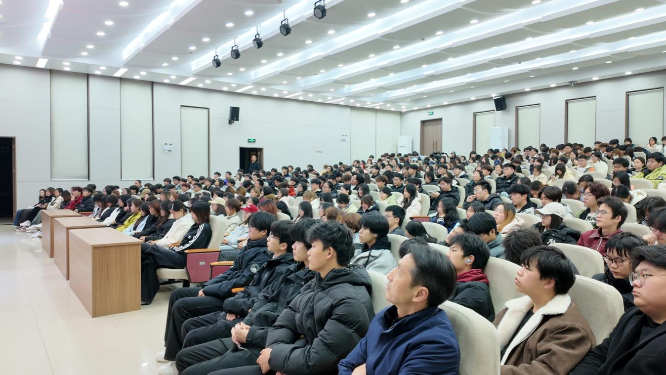 讲座现场,学工处、保卫工作部、各二级学院相关工作人员及部分学生代表齐聚参训;各学院组织晚自习、一站式学生社区让学生线上同步参与。