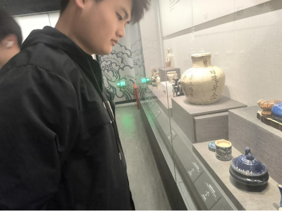 第一站,同学们来到了邯郸博物馆磁州窑展区进行参观研学。宋代“白地黑花”梅瓶深深吸引同学们的目光,瓶身上,无论是人物还是景观,飞扬的衣角、憨态可掬的神情,仿佛要冲破釉面,带着八百年前的欢笑声奔到眼前。当同学们把手轻轻搭在复制品上,粗糙的触感从掌心传来,仿佛能感应到千年前匠人掌心的温度。在讲解员的引导下,大家深入了解了窑具的功能、宋代白地黑花瓷的艺术魅力以及磁州窑匠人“落笔即成永恒”、粗犷中见细腻的独特绘画技艺,身临其境地感受到历史的厚重与匠心的永恒。