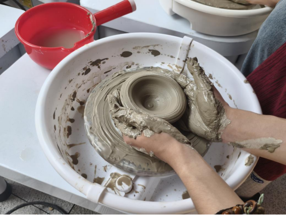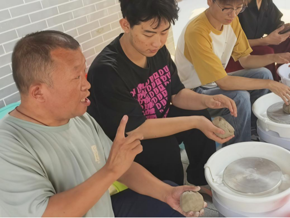 在制瓷工坊,同学们亲身参与了制陶的核心环节——拉坯。通过观摩非遗文化传承人郭师傅行云流水般的技艺示范,并在师傅指导下克服初始笨拙、调整手势力道、感受泥土韧性,最终成功塑造出属于自己的陶器作品。“拉坯”让同学们深刻体会到陶艺“稳、准、柔”的操作要求,感悟到“与泥土对话”的合作关系以及“泥土与匠心共舞”的艺术真谛,每一件带着手印与瑕疵的陶器,都成为同学们汗水与心得的见证。