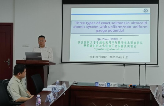 下午的报告由周勤教授主讲,主题为“均匀和非均匀规范势作用下超冷原子系统中的各类精确孤子”。周教授聚焦于非线性局域波的理论研究,深入探讨了超冷原子系统中的精确孤子现象,他详细介绍了在这一领域的研究进展,以及在Physical Review A/E/Research、Optics Express等知名期刊上发表的多篇学术论文。周教授的研究成果不仅在理论上具有重要的学术价值,而且在实际应用中也展现出广阔的前景,他还分享了在科研过程中的一些心得体会,鼓励师生们勇于探索和创新。