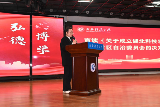 图为学生工作部副部长孙萍首先宣读《关于成立湖北科技学院学生社区自治委员会的决定》