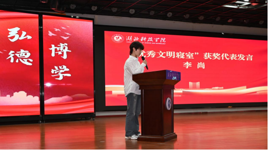 图为“优秀文明寝室”获奖代表李尚同学发言