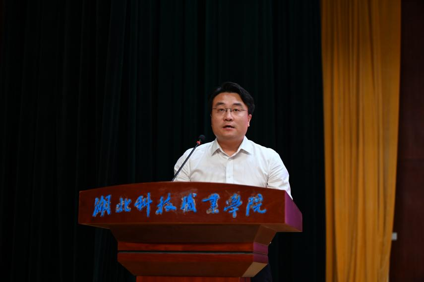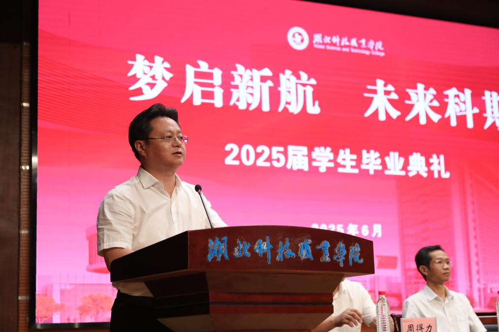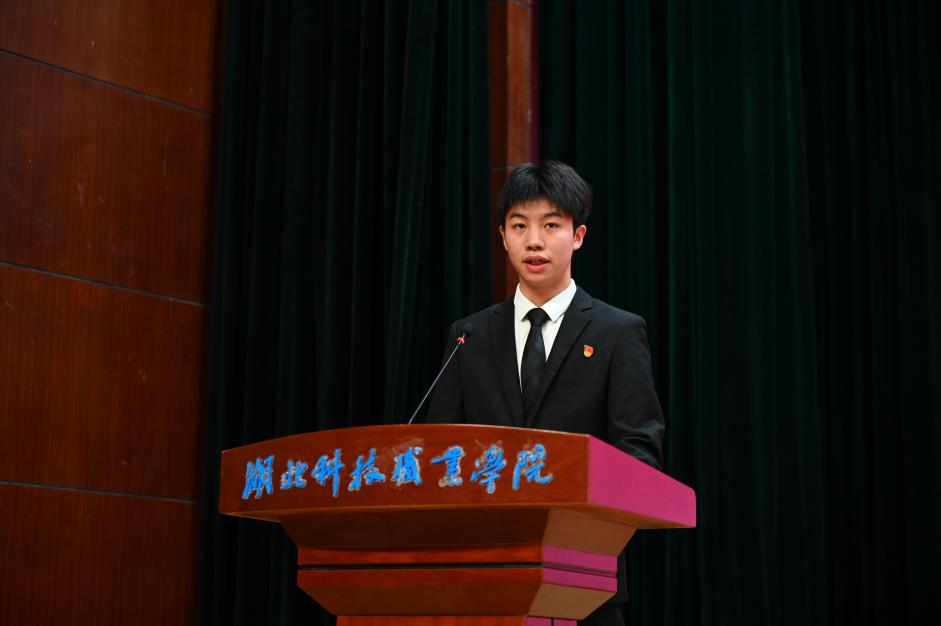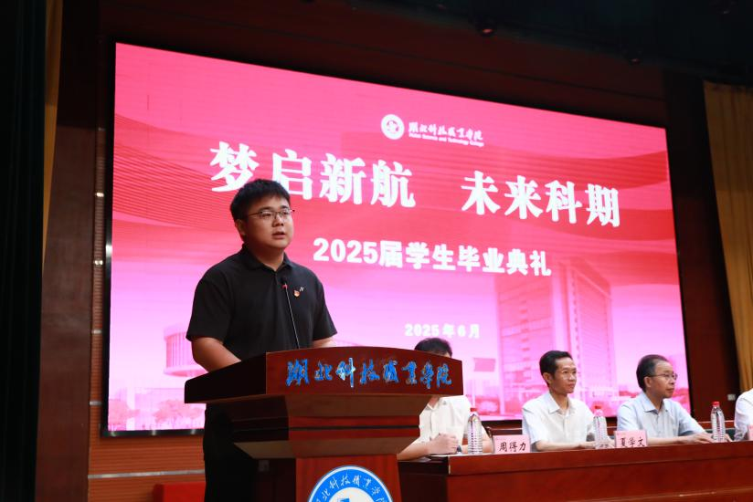 工商管理学院人力资源管理专业孙彬彬作为优秀毕业生代表发言。他回顾三年来在湖科的成长历程,从专业成绩中游到荣获国家奖学金,从省级选拔赛第一到世界职业院校技能大赛摘银,他用“知不足而奋进,望远山而前行”激励学弟学妹们不断突破自己、勇敢追梦,创造属于自己的辉煌,并深情告白学校:“湖科育我,我爱湖科。”
